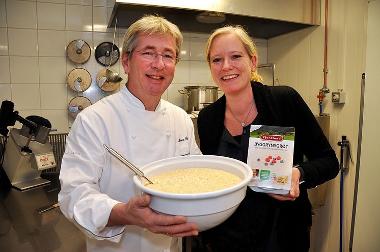 Kokk Arne Brimi og grøtsjef i Fjordland, Ellen Molstad Dahle er klar til å servere byggrynsgrøt.