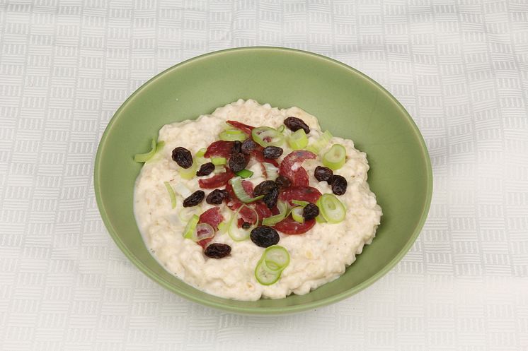 Byggrynsgrøt med spekeskinke, vårløk og rosiner