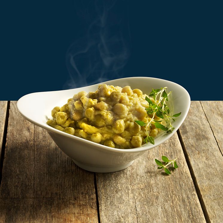 Serveringsklar ertestuing fra Fjordland. Ertestuingen er laget på erter som har ligget i vann natten over. Morgenen etter moses ertene og kokes til stuing, akkurat slik tradisjonell ertestuing skal lages.