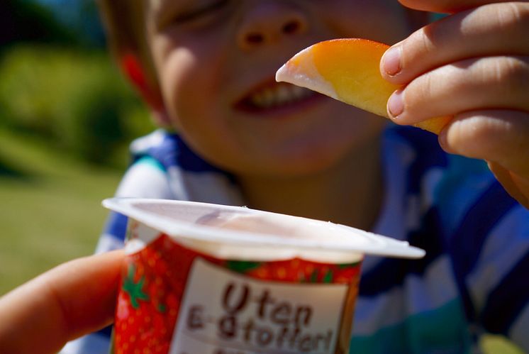 Frukt med yoghurt som dip. Skjær opp biter av epler, pære eller søte grønnsaker som f.eks. gulrot og la barna dyppe dette i yoghurten.