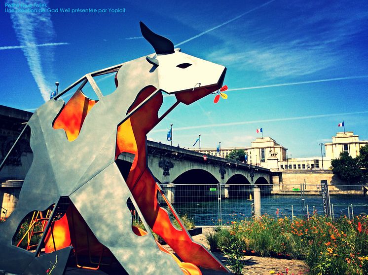 Yoplait yoghurt feirer 50 år med en gedigen blomstereng og åtte kunstverk i form av lekeapparater foran Eiffeltårnet i Paris.