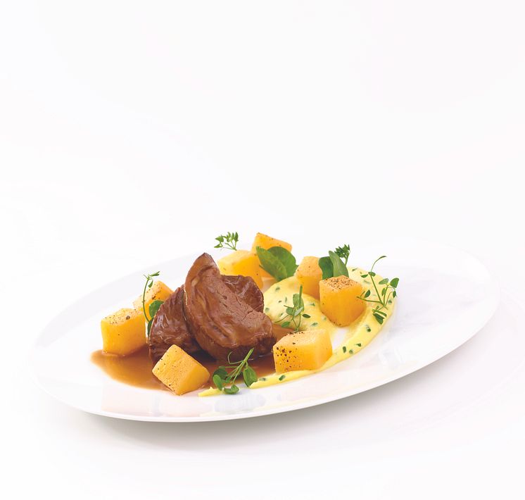Okse høyrygg. Middag utviklet av Gastronomisk Institutt for Fjordland. Kjøttet er tilberedt sous vide i en løksaus med eplesider. Potetstappe med selleri og gressløk og bakt kålrot serveres til.