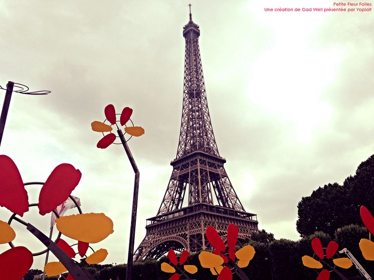 Yoplait yoghurt feirer 50 år med en gedigen blomstereng og åtte kunstverk i form av lekeapparater foran Eiffeltårnet i Paris.