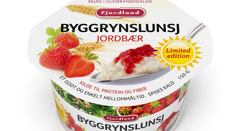Omtrent samtidig som de første jordbærplantene starter å bære frukt vil Fjordlands nye byggrynslunsj med jordbær dukke opp i norske butikkhyller. Byggrynslunsjen er en miniversjon av byggrynsgrøten, kun tilsatt litt fløte og med sukkerredusert jordbærsyltetøy som tilbehør. Som de andre to byggrynslunsjene, blåbær og bringebær, har også denne fått Nyt Norge merket.