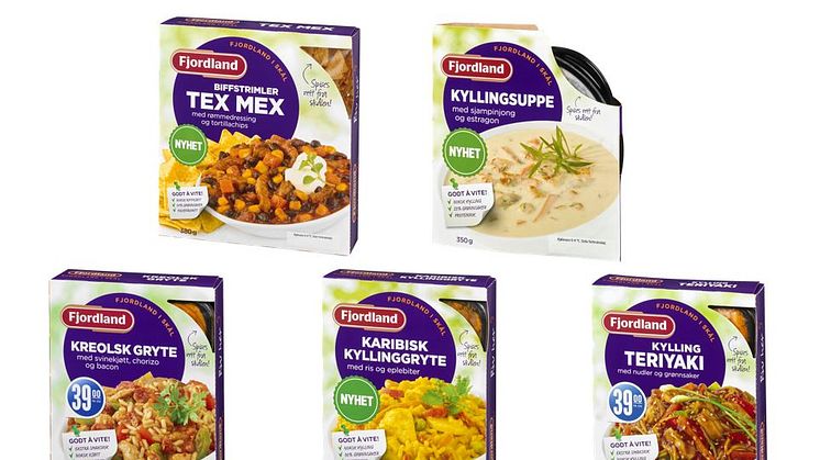 De nye rettene; Karibisk kyllinggryte, Tex Mex med langtidskokt storfekjøtt, Kyllingsuppe, Kreolsk gryte og Kylling teriyaki inneholder i snitt 29% grønnsaker.