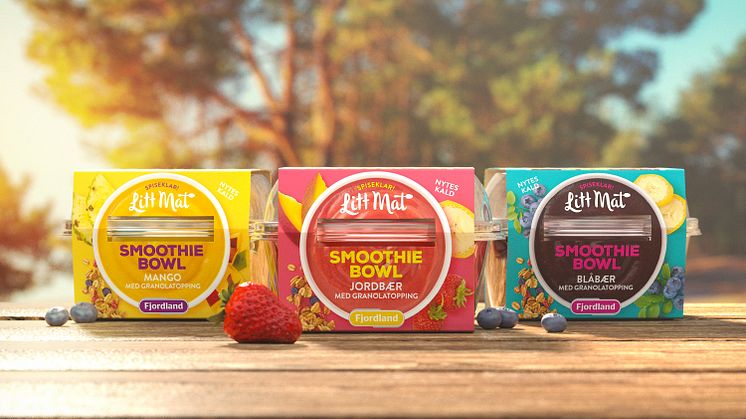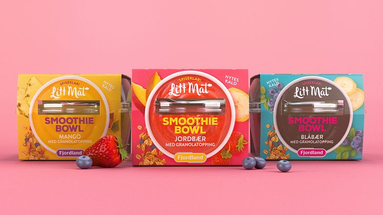 Smoothie Bowl vil gjøre det enklere å nyte et fiberrikt frukt- og bærmåltid på farten. Bloggere og trendsettere over hele verden har allerede tatt trenden til seg, og Fjordland gjør den nå ferdig tilberedt og spiseklar. Litt Mat Smoothie Bowl lanseres i tre varianter; Rød: Jordbær, mango, appelsin og banan, Blå: Blåbær, jordbær, eple og banan, og Gul: Mango, ananas, banan og ingefær.