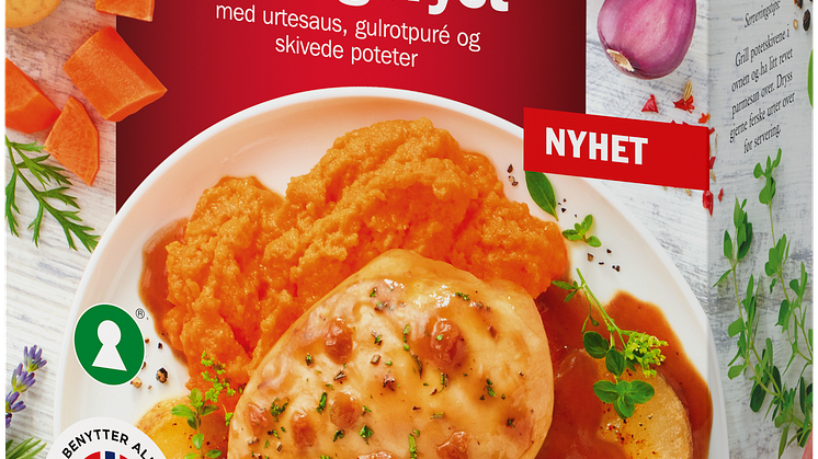 Nyhet! Kyllingbryst med urtesaus, gulrotpuré og skivede poteter