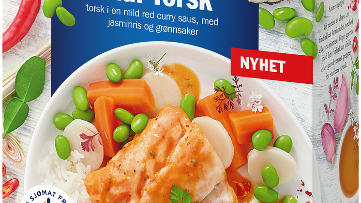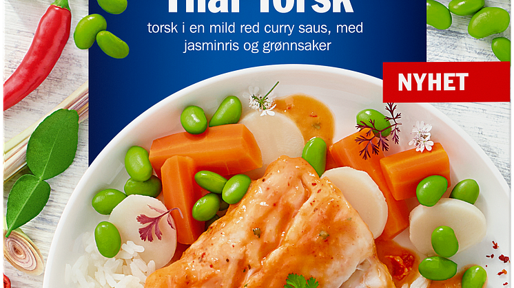 Vår nye Thai Torsk er ikke mindre enn en smakfull kultursammensmeltning! Her får du norsk torskefilet av ypperste kvalitet som er Sous Vide behandlet sammen med en fyldig red curry saus. I sausen finner man balanserte smaker fra det thailandske kjøkken: Kokosmelk, sitrongress, kaffirlime, samt chili og ingefær. I tillegg inneholder retten hele 26 % grønnsaker, også disse inspirert fra det thailandske kjøkken. Du kan glede deg til edamamebønner, gulrøtter og sprø vannkastanjer. Thai Torsk inneholder dessuten lite fett og er rik på protein og jod.