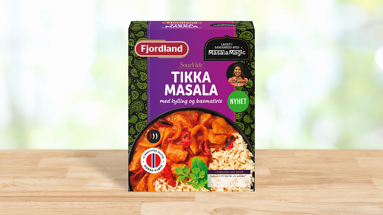 Indisk mat fortsetter å vokse i popularitet, spesielt innen ferske ferdigretter. I 2022 startet Fjordland et samarbeid med den norskindiske kokken Niru Kumra og MasalaMagic. Vi har lansert klassikere som Butter Chicken, Korma og Chicken Tandoori. MasalaMagic-serien er smaksrik indisk mat tilberedt på en rask og enkel måte. Nå kommer vi med enda en nyhet til serien, nemlig Tikka Masala i Sous vide. Her finner man saftig norsk kylling i en smaksrik saus med løk og paprika, og krydret basmatiris. Tikka Masala er den mest kjente indiske retten i Norge, og passer som middag til deg som liker mat med mange interessante smaker.